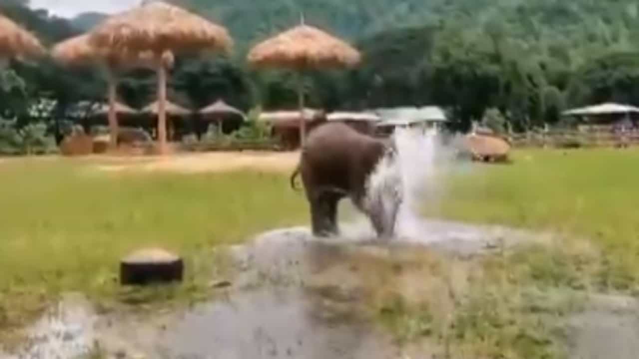 म्हणूनच की काय हत्तीचे पिल्लू पाण्यात मनसोक्तपणे खेळत आहे. हे पिल्लू आपल्या सोंडेने फुटलेल्या पाईपलाईनशी खेळत आहे. तसेच बाहेर येणाऱ्या पाण्याच्या तुषारामध्ये स्वत: चे अंग भिजवून घेत आहे. हत्तीचे पिल्लू पाण्यात मस्तपैकी खेळत आहे.