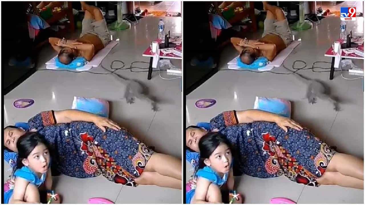 व्हायरल होत असलेल्या व्हिडीओमध्ये कुटुंबातील काही सदस्य जमिनीवर पडलेले दिसत आहेत. एक मुलगी टीव्ही पाहत असताना. इतक्यात एक मॉनिटर लिजर्ड म्हणजेच घोरपड तिथं शिरते. हे पाहून मुलगी घाबरते