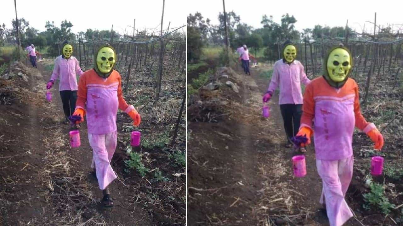 नाशिक: इंटरनेटवर कधी काय व्हायरल होईल हे सांगता येत नाही. त्यातल्या त्यात शेती संबंधिचे (Farmer Video) अनेक जुगाडही सोशल मीडियावर (Social Media) लगेच व्हायरल होत असतात. आता असाच एक फोटो चांगलाच व्हायरल (Viral) होत आहे. हा फोटो पाहून अनेकजण कोड्यात पडले आहे. हा फोटो आहे, भुताच्या चेहऱ्याचे मास्क घातलेल्या काही व्यक्तीचा, जे द्राक्षबागेत काहीतरी घेऊन जाताना दिसत आहेत.