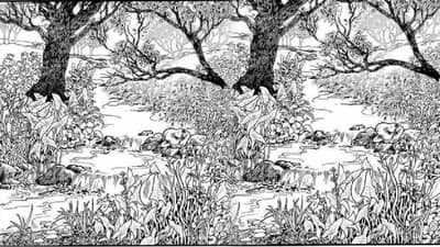 हे चित्र एक कुतूहलजनक कोडे आहे जिथे आपल्याला जंगलाच्या स्केचच्या आत मुलीचा चेहरा ओळखावा लागतो जिथे ससे, कासवे, मासे, इत्यादी अनेक प्राणी देखील आहेत.