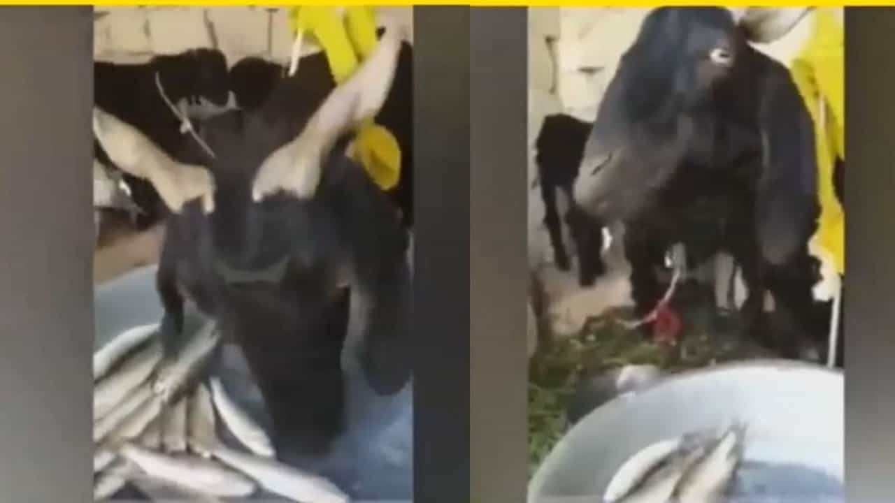 Viral Video : मासे खाणारी बकरी पाहून नेटकरी आवाक, म्हणाले पहिल्यांदाच ‘मटणाला मासे खाताना पाहिलं!’