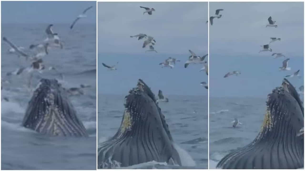 Latest Viral video : पक्ष्यांचा थवा समुद्रावर घालत होता घिरट्या, अचानक भला मोठा व्हेल आला पाण्याबाहेर आणि…