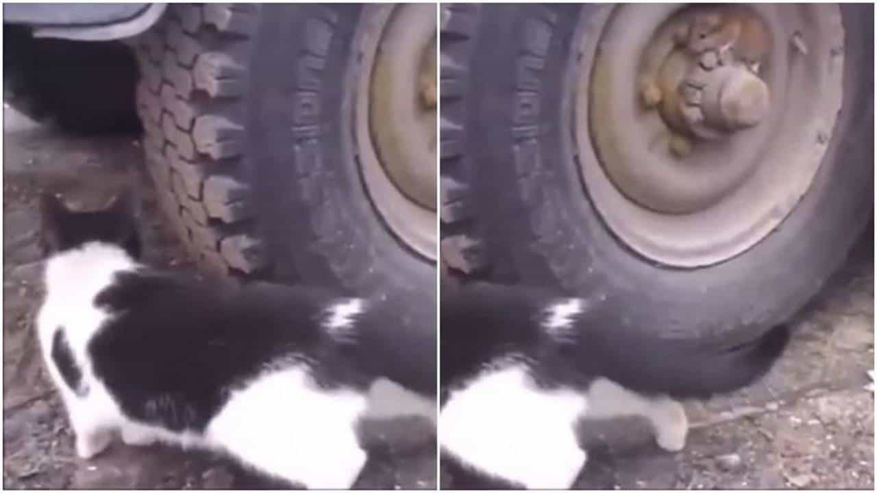 मांजर टायरभोवती उंदीर शोधत आहे, पण बराच वेळ शोधल्यानंतरही तिला उंदीर सापडत नाही. पण तो उंदीर त्या मांजरीच्या डोळ्यांसमोरच बसला आहे.