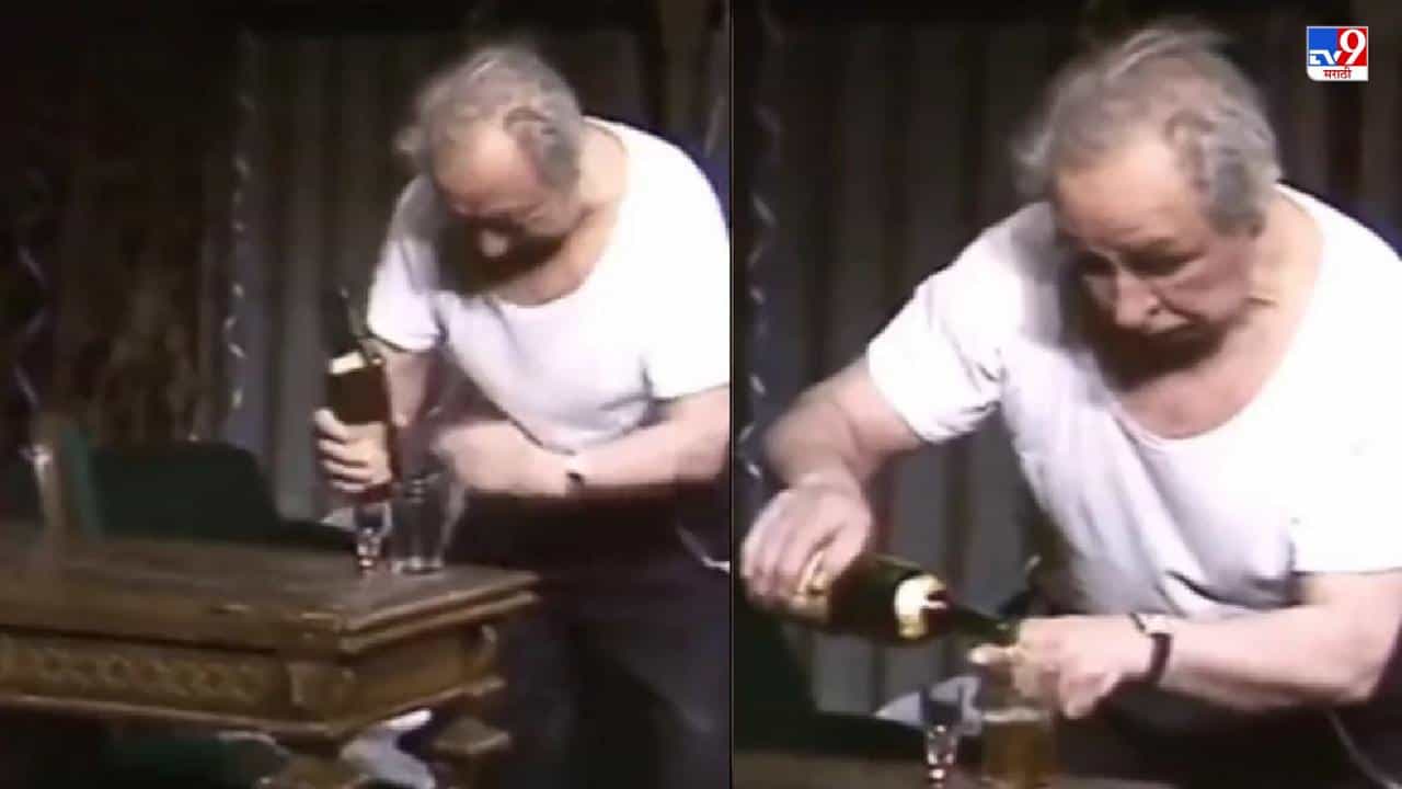 या व्हिडिओ क्लिपमध्ये एक वृद्ध मद्यधुंद अवस्थेत टेबलाजवळ उभा असल्याचे दिसत आहे. तो बाटलीतून वाइन ग्लासमध्ये भरण्याचा प्रयत्न करतो, पण त्याचे हात थरथरू लागतात.