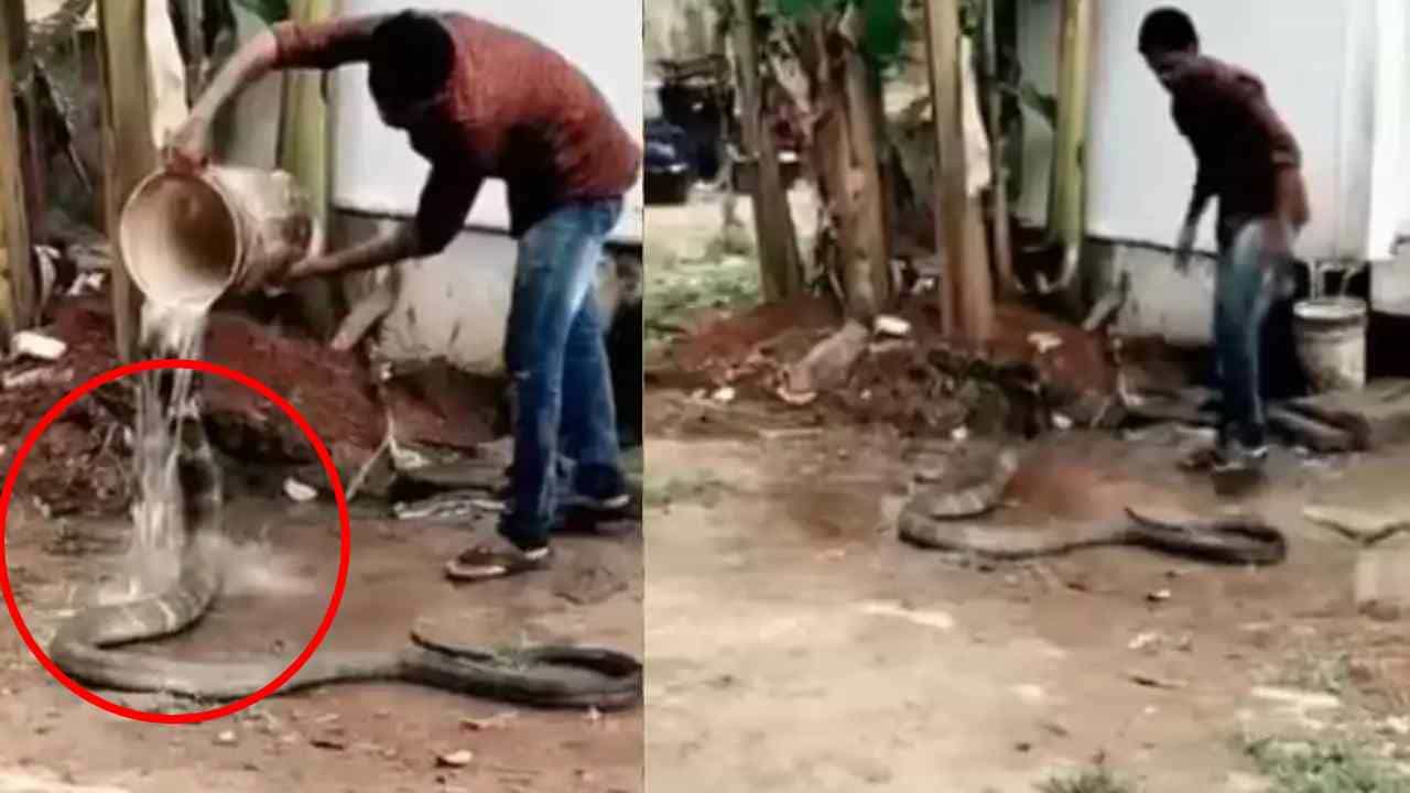 या व्हायरल व्हिडीओमध्ये एक माणूस एका विशाल कोब्राला बादलीने आंघोळ घालताना दिसत आहे. गंमत म्हणजे सापसुद्धा त्याचा आनंद घेताना दिसतो.