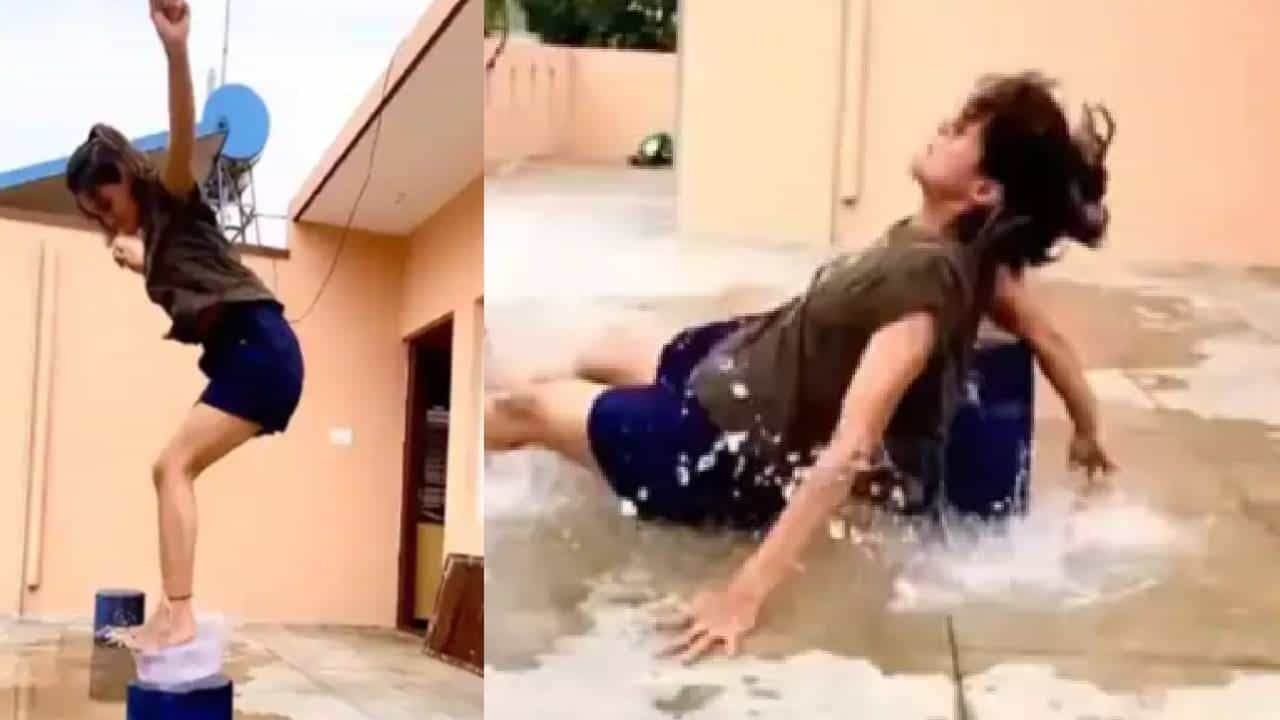 मुंबई : सध्या सोशल मीडियावर कधी काय व्हायरल (Viral Video) होईल सांगता येत नाही. सध्या एका मुलीचा व्हीडिओ खूप जास्त व्हायरल होत आहे. यात ती स्टंट करायला जाते अन् पटकन पडते. तिचा हा व्हीडिओ सध्या सोशल मीडियावर व्हायरल होत आहे. एका छोट्या स्टुलवर एक छोटा पाण्याचा टब ठेवला आहे. मुलगी टबसोबत स्टंट करण्याचा प्रयत्न करतेय. टबच्या पाण्याला हवेत स्पर्श करणाऱ्या टबसमोर मुलीला उडी मारावी लागते. मुलगी स्टंट (Stunt) करण्यासाठी सर्व तयारी करते. टबमध्ये भरलेल्या पाण्याला स्पर्श करताना ती पाण्यावरून उडी मारण्याचा प्रयत्न करते. पण ते साध्य होत नाही. तिचा पाय टबमध्येच अडकतो आणि ती खाली पडली. हा व्हीडिओ सध्या सोशल मीडियावर व्हायरल होत आहे.