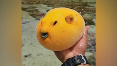 ट्विटरवरती Massimo यांनी पफर फिशचा व्हिडीओ व्हायरल केला आहे. पफर फिशचं नाव कधी तुम्ही ऐकलं आहे का ? तो एक असा मासा आहे, जो स्वतःमध्ये पाणी भरतो. विशेष म्हणजे ही या माशाची संरक्षण यंत्रणा आहे. बाकीच्या माशांमध्ये आणि या माशांमध्ये हा फरक आहे. अशाचं एका पिवळ्या पफर माशाचा व्हिडिओ मोठ्या प्रमाणात व्हायरल होत आहे. पफर फिशचा रंग हा एखाद्या गावठी पिकलेल्या आंब्यासारखा असतो. काही लोकांना सुरुवातीला पाण्यात वाहताना पाहून आंब्याचे डोळे, तोंड, कान बाहेर आल्याचे दिसले. पाण्यातून बाहेर काढल्यानंतर पिवळ्या रंगाचा पफर मासा आहे असं समजलं. या माशाला गोल्डन पफर फिश असेही म्हणतात.