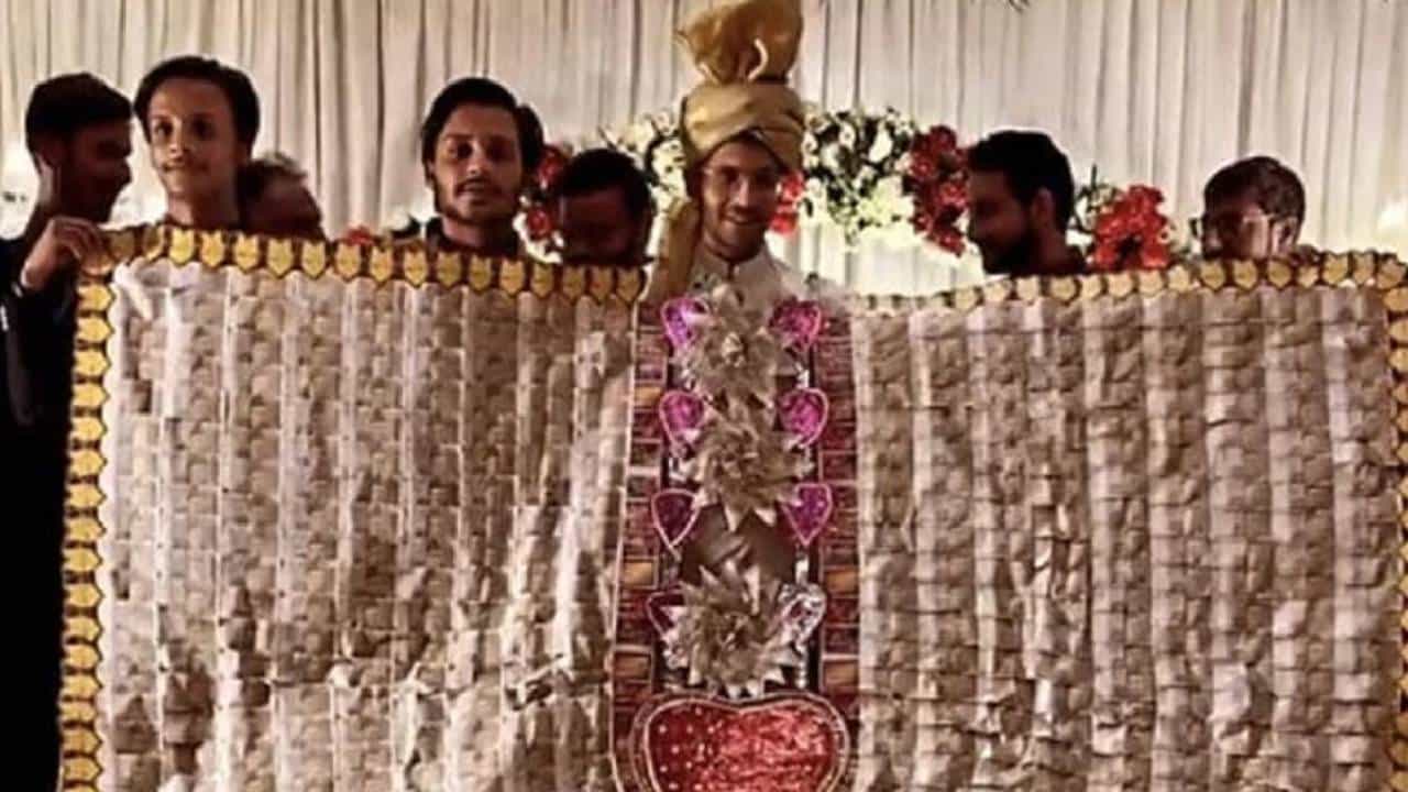 नोटांच्या माळेमुळे नवरदेवाचा केवळ चेहराच दिसतो. मात्र, या माळेत किती नोटा जोडण्यात आल्या आहेत, याची माहिती मिळू शकलेली नाही.
