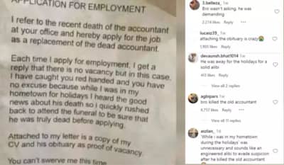 अर्जात असे लिहिले आहे की, “मला तुमच्या कार्यालयातील अकाउंटंटच्या नुकताच मृत्यू झाल्याची माहिती मिळाली. मी मरण पावलेल्या अकाउंटंटच्या जागी नोकरीसाठी अर्ज करत आहे.” त्या व्यक्तीने आपल्या अर्जात पुढे म्हटले आहे की, त्याने यापूर्वी अनेकदा अर्ज केला होता. मात्र प्रत्येक वेळी कंपनीने जागा रिक्त नसल्याचे सांगितले होते.