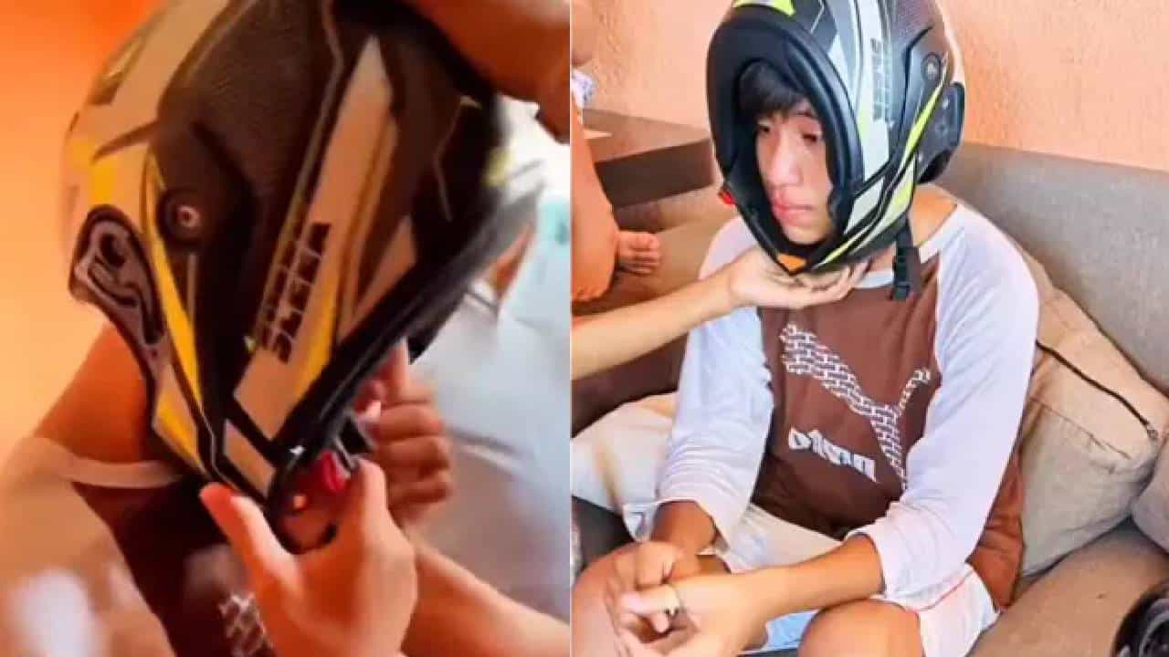 मुंबई : बाईक चालवताना हेल्मेट (helmet) अधिक गरजेचं आहे. मग तुम्हाला ही सुध्दा गोष्ट माहित असेल की, वाहतूक पोलिसांच्या नियमानुसार बाईक चालकाने हेल्मेट घातलं नसेल आणि समजा तो सापडला. तर पैशाच्या रुपात त्याला मोठा दंड भरावा लागतो. बाईक चालवताना दोन्ही व्यक्तींनी हेल्मेट (helmet viral story) घालणं गरजेचं आहे. समजा बाईकचा अपघात झाल्यास दोन्ही व्यक्तींना गंभीर इजा होण्याची शक्यता कमी असते. त्याचबरोबर तुमच्या डोक्याला कसल्याही प्रकारचा मार लागत नाही. सध्या हेल्मेटचा एक व्हिडीओ सोशल मीडियावर (trending video) चांगलाचं व्हायरल झाला आहे. त्यामध्ये एका मुलाच्या डोक्यात हेल्मेट अडकलं आहे.
