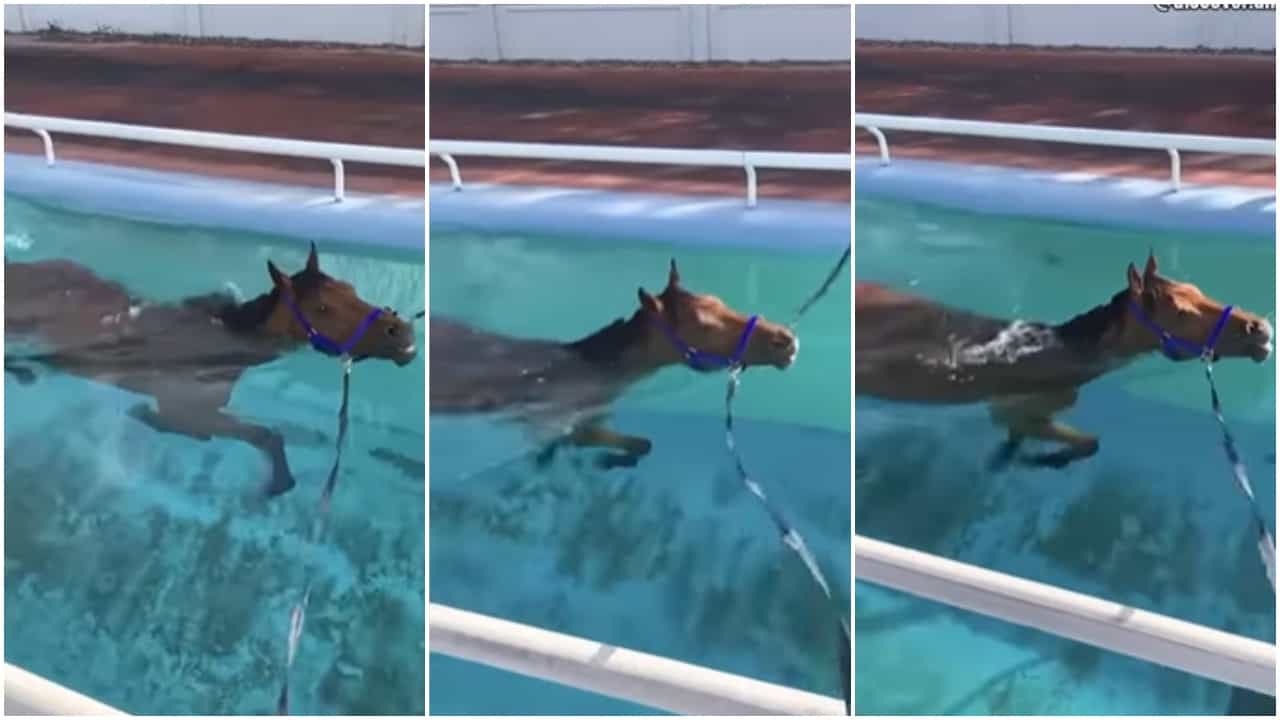 घोडे पाण्याखाली श्वास घेण्यास असमर्थ असल्याने ते नैसर्गिकरित्या त्यांचे डोके पाण्याच्या वर ठेवतात. त्यांचे तोंड आणि नाक पाण्याच्या वर ठेवल्याने त्यांना श्वास घेण्यास मदत होते. तथापि, जेव्हा घोडा पाण्याखाली असतो तेव्हा त्याच्या हृदयाचे ठोके वाढतात आणि जड श्वास घेण्याची शक्यता असते. पोहणे घोड्यांसाठी फायदेशीर आहे. सोशल मीडियावर एक व्हिडिओ व्हायरल होत आहे ज्यामध्ये एक तपकिरी घोडा तलावात पोहताना दिसत आहे. घोडा त्याच्या पोहण्याचा आनंद घेत असल्याचे दिसते आणि तो कॅमेराकडेही पाहत आहे.