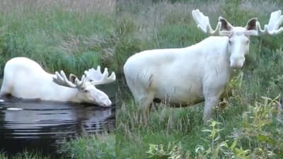Extraordinary white moose was spotted taking a dip in a pool in Sweden’s Varmland County