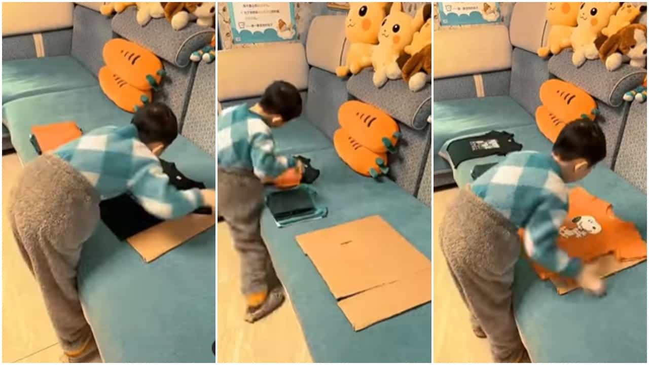 Kid jugaad : आता लहान मुलेही जुगाडू झाली आहेत. असाच एक जुगाड व्हिडिओ (Video) सध्या सोशल मीडियावर (Social media) व्हायरल (Viral) होत आहे. हा व्हिडिओ एका लहान मुलाचा आहे. व्हायरल व्हिडिओमध्ये दिसत आहे, की एक लहान मूल कपड्यांची घडी घालण्यासाठी जुगाड करत आहे.