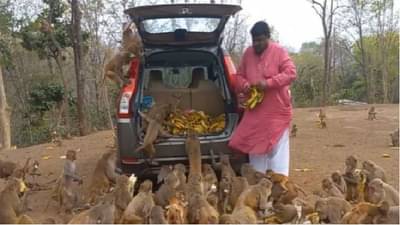 या माणसाने कार उभी करताच त्याच्या भोवती माकडांनी मोठी गर्दी केली आहे. या माणसाने कारमध्ये उतरुन आपल्या डिक्कीमधील केळी काढली आहे. कारमध्ये कित्येक डझन केळी असल्यामुळे माकडांनी माणसासमोर गर्दी केली आहे. व्हिडीओतील माणूस समोर असलेल्या माकडांना केळी वाटतोय. काही माकडांनी तर कारच्या डिक्कीमध्ये चढून हातानेच केळी घेतल्या आहेत. तर काही माकडे केळी घेऊन पळून जात आहेत. एवढं सारं होत असूनदेखील तो माणूस काहीही करत नाहीये. उलट तो माकडांना अत्यंत प्रेमाने केळी वाटतो आहे.