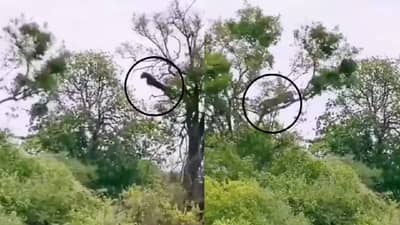 माकडाची शिकार करण्यासाठी बिबट्या पहिल्यांदा झाडावर चढला. बिबट्याला पाहून माकड दुसऱ्या झाडावर गेलं, त्याचवेळी बिबट्यानं सुध्दा त्या झाडावर झेप घेतली. आपला जीव वाचवण्यासाठी माकड पुन्हा त्याच झाडावर आलं. परंतु यावेळी माकडाचं नशीब कमजोर असावं असं म्हटलं जात आहे. ज्यावेळी बिबट्याने झाडावर उडी घेतली. त्यावेळी बिबट्या माकडाला तोंडात पकडून खाली पडला.
