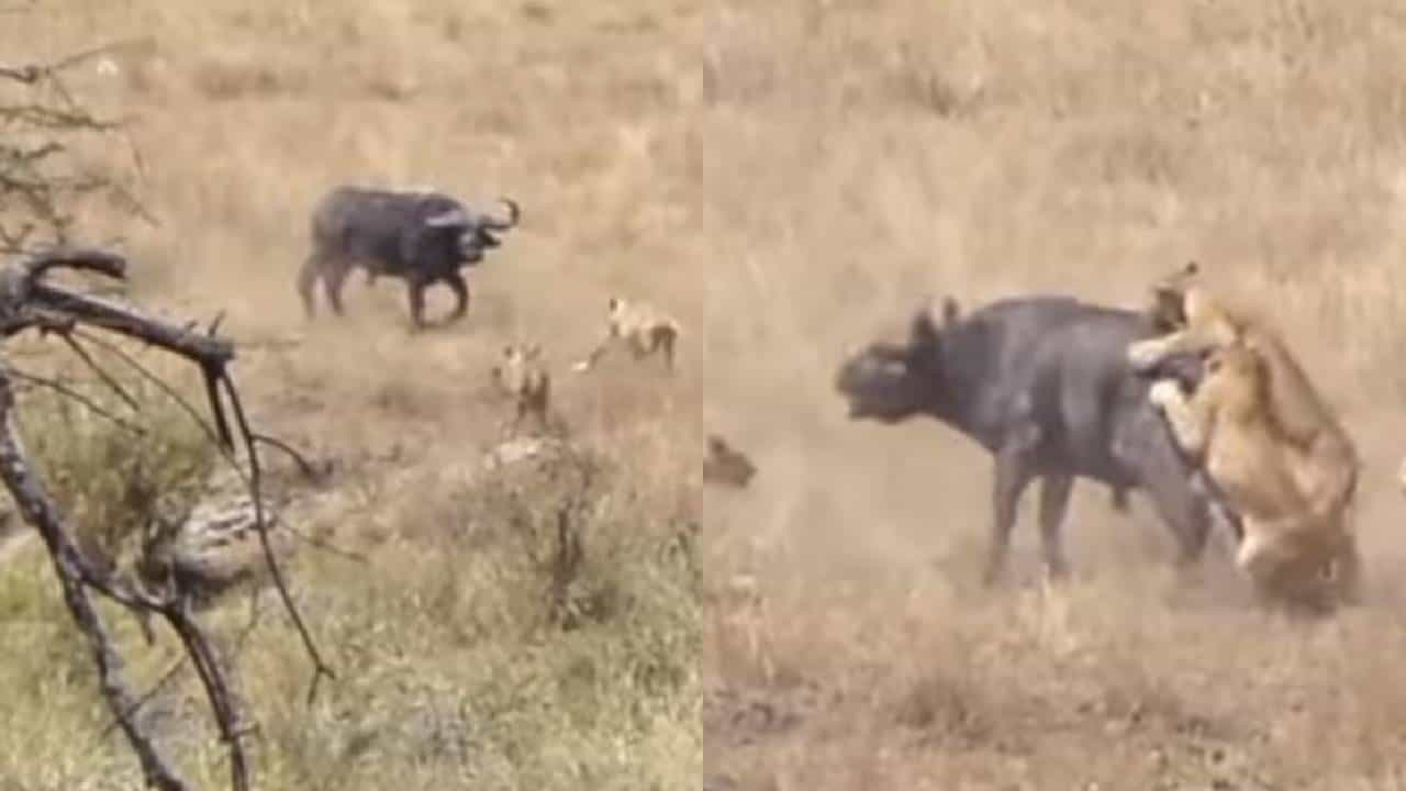 एक व्हीडिओ आताही समोर आला आहे. यात उन्हामुळे सुकलेलं गवत पाहायला मिळतंय. त्यात एक म्हैस उभी आहे. तिच्याभोवती चार सिंह आहेत. त्यातला एक-एक करून या म्हशीवर हल्ला चढवतात.