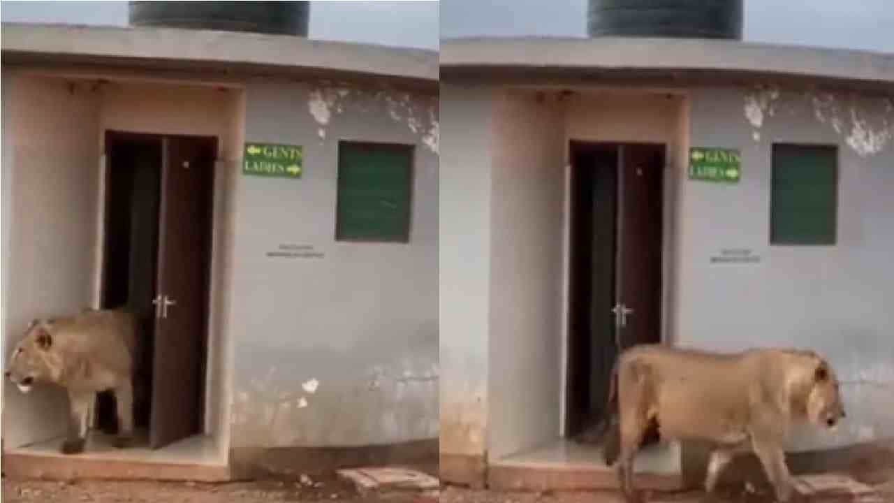 Video | शिकलेल्या सिंहाची सोशल मीडियावर चर्चा, निघाला सुलभ शौचालयातून बाहेर, व्हिडीओ व्हायरल