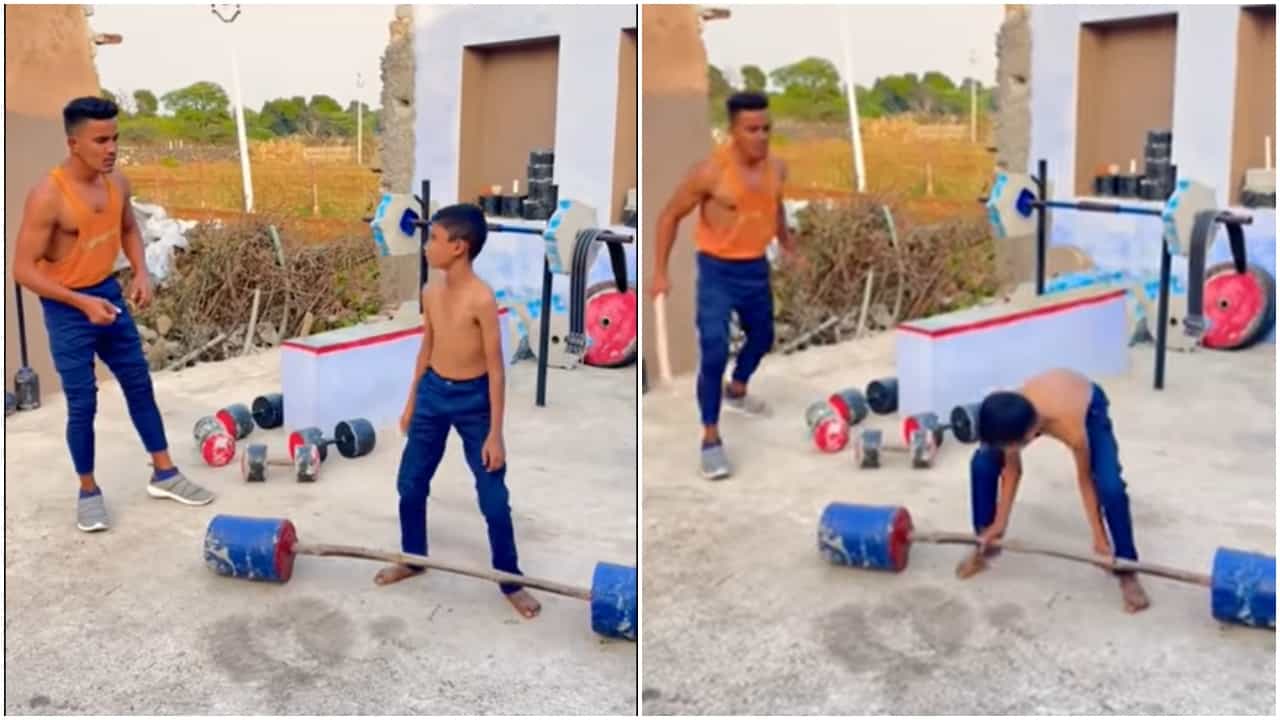 व्हिडिओमध्ये आपल्याला दिसतंय, की दोघेजण व्यायाम करत आहेत. मोठा मुलगा लहान मुलाला व्यायाम करण्यास प्रोत्साहित करत आहे. त्याच्यासमोर भल्यामोठ्या वजनाचा बार आहे. लहान मुलगा तो उचलू शकत नाही. मात्र मोठा त्याला ते उचलण्यास सांगतो. लहान मुलगा नाही म्हणतो, त्यावेळी तो मागून काठी आणतो आणि त्याला पुन्हा वजन उचलण्यास सांगतो. लहान मुलगाही मग ते उचलण्याचा प्रयत्न करतो आणि त्यात तो यशस्वीही होतो.