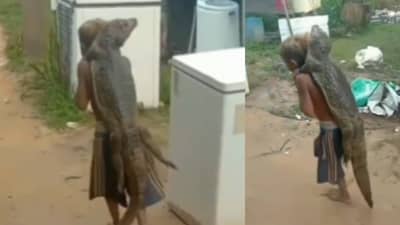 चिमुरडा मगरीला पाठीवर घेऊन निर्भयपणे रस्त्यावरून चालत आहे. गेल्या महिन्यात 16 फेब्रुवारी रोजी ट्विटरवर शेअर करण्यात आलेली ही क्लिप डिलीट करण्यात आली आहे. ‘मगरीचा आत्मसन्मान लगेच चव्हाट्यावर आला असावा,’ असे कॅप्शन या व्हिडिओसोबत देण्यात आले आहे, ज्यात एक मुलगा मगरीला आपल्या पाठीवर घेऊन जाताना दिसत आहे. लहान मुलाने हाताने मगरीचे पुढचे पाय पकडून आपल्या खांद्याजवळ गुंडाळून घेतलेत, तर बाकीची मगर मागच्या बाजूला लटकलेली दिसली.