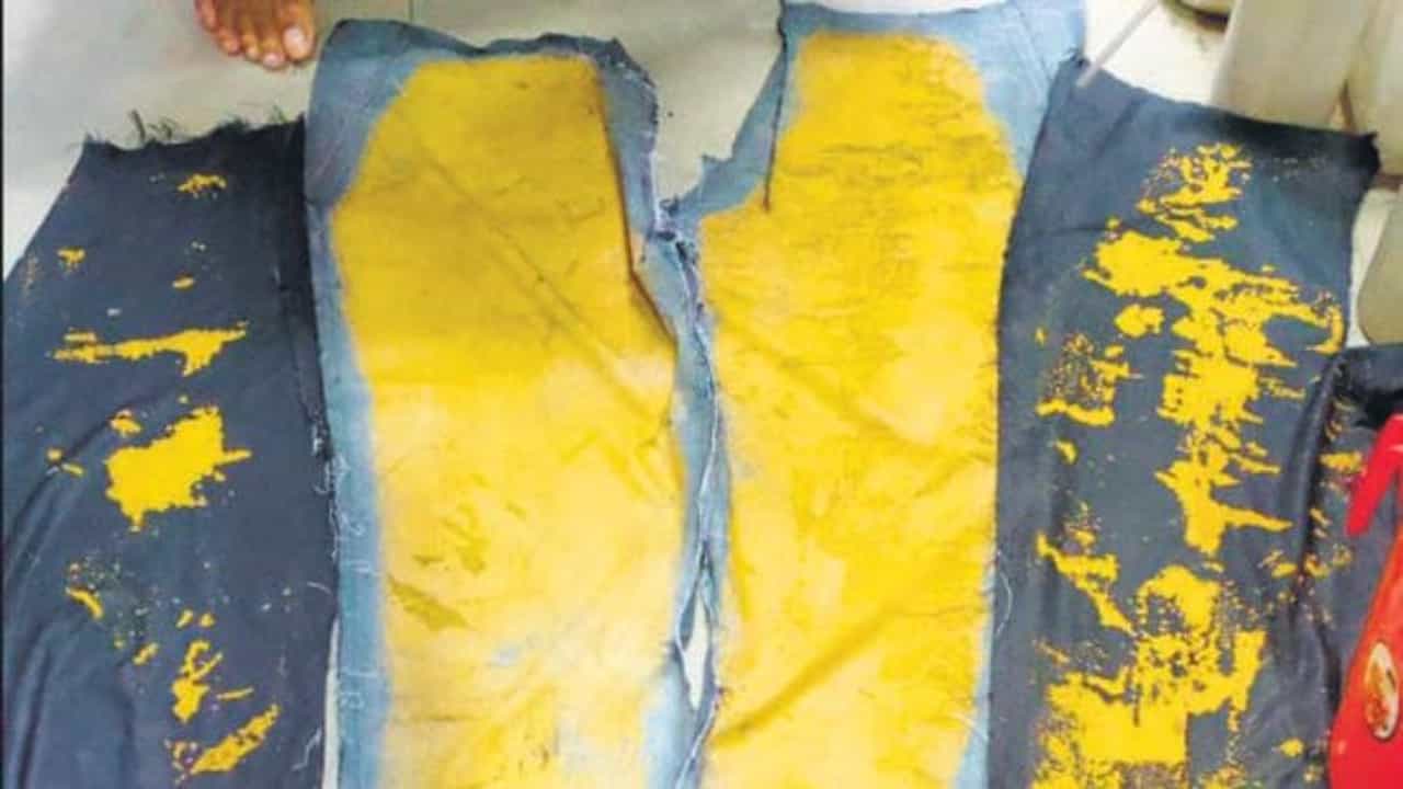 तिरुवनंतपुरम: सध्या सोशल मीडियावर विचित्र पिवळ्या रंगातील जीन्सची काही छायाचित्रे व्हायरत होत आहे. जीन्सचे हे फोटो बघून सुरुवातीला वेगळीच शंका येते. मात्र, बारकाईने पाहिल्यास हा तुम्ही समजताय तो प्रकार नसल्याचे तुमच्या लक्षात येईल. तर जीन्सचे हे फोटो केरळातील कन्नूर विमानतळावरचे आहेत. जीन्सवर लागलेला विचित्र पिवळा रंग हा दुसरे तिसरे काही नसून सोनं आहे. हे ऐकून तुम्हाला नक्कीच धक्का बसला असेल. कन्नूर विमानतळावरील अधिकाऱ्यांची अवस्था अशीच काहीशी झाली होती. (Gold Smuggling unique technique at Kannur airport)