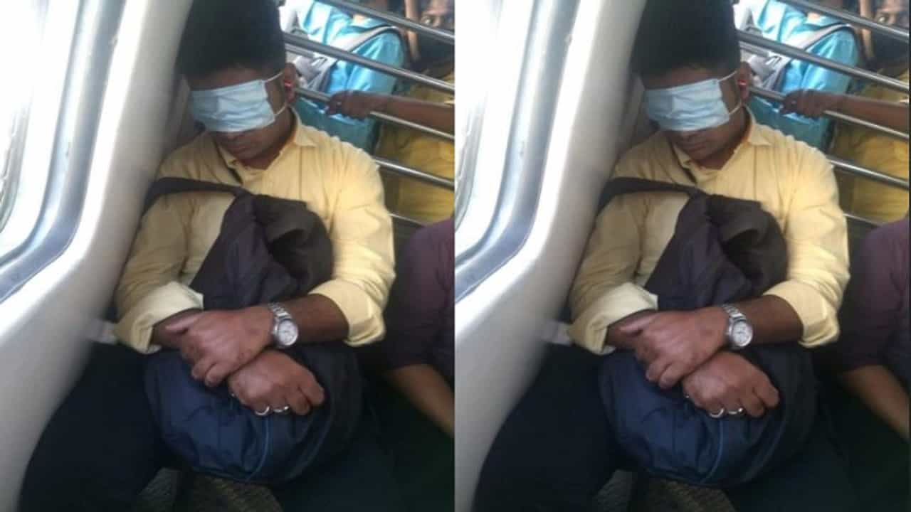 मुंबई लोकलमध्ये पठ्ठ्या मास्क डोळ्यावर लावून झोपला, महाराष्ट्राचे मंत्री म्हणाले, कोरोनाची काय चूक?