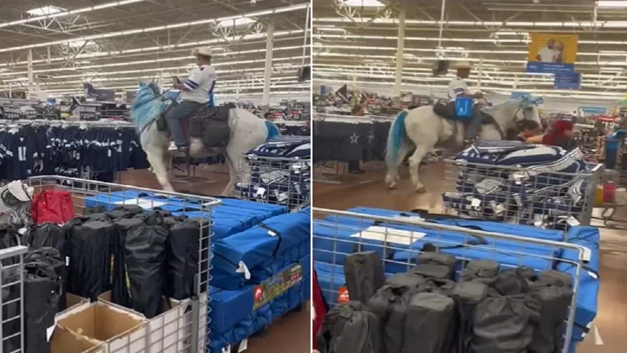 हा व्हिडीओ टेक्सस मधला आहे. हा माणूस घोडा घेऊन वॉलमार्ट शोरूम मध्ये आला होता. @MadVidss या नावाने हा व्हिडीओ सोशल मीडियावर शेअर करण्यात आलाय. 21 सेकंदाचा हा व्हिडीओ हजारो लोकांनी पाहिलाय. “हा खूप नशीबवान आहे की याच्या घोड्याने मॉलमध्ये घाण केली नाहीये” अशी प्रतिक्रिया लोकांनी यावर दिलीये. पांढऱ्या घोड्यावर हा माणूस मॉल मध्ये फिरतोय. त्याने हातात एक बादली धरलीये. ही बादली त्याने कदाचित मॉल मधूनच घेतली असावी. हा व्हिडीओ खूप व्हायरल झालाय.
