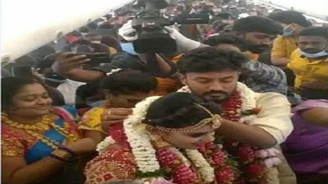 विमान अवकाशात झेपावल्यानंतर राकेशने दिक्षणाच्या गळ्यात मंगळसूत्र बांधलं. या विमानाने मदुरै येथून उड्डाण घेतलं होतं. विमान हवेत असताना लग्न समारंभ पार पडला. त्यानंतर विमान तत्तुकुडी विमानतळावर लँड झालं. या लग्नाचे फोटो आता सोशल मीडियावर व्हायरल होत आहेत.