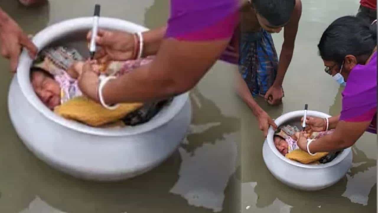 सोशल मीडियावर तुम्हाला कधी काय पाहायला मिळेल सांगता येत नाही. काही गोष्टी अशा असतात, ज्या तुमच्या हृदयात नेहमीच्या कोरल्या जातात. असाच एक फोटो सध्या सोशल मीडियावर व्हायरल होत आहे. हा फोटो पाहून तुम्हाला आधी थोडं विचित्र वाटेल, पण यामागची कहाणी ऐकल्यानंतर तुम्हालाही सुखद धक्का बसेल. या फोटोमध्ये आरोग्य कर्मचारी नवजात बालकाला पोलिओ डोस देत आहे. आणि हे तान्हं बाळ एका पातेल्यात ठेवण्यात आलं आहे. (newborn-baby-floating-in-cooking-pot-for-polio-dose-in-west-bengal-see-viral-photo-sundarban)