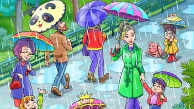 या चित्राकडे बघून सुद्धा तुमचा गोंधळ उडेल. कारण या चित्रात तुम्हाला बेडूक शोधायचा आहे. चित्र पहा, यात खूप पाऊस पडतोय, खूप लोकं आहेत आणि सगळे छत्री घेऊन रस्त्याने चाललेत. हे कुठलं तरी गार्डन असावं. आता यात तुम्हाला बेडूक शोधायचा आहे. तुम्हाला या चित्रातील छत्र्यांवर सुद्धा काही प्रिंट्स दिसतील. हे प्राण्यांचे, पक्ष्यांचे प्रिंट्स आहेत. काही वेळ तुम्हाला असंही वाटू शकतं की बेडूक या छत्र्यांवरच आहे. इतका पाऊस आहे म्हणल्यावर बेडूक इथेच कुठेतरी असू शकतो.