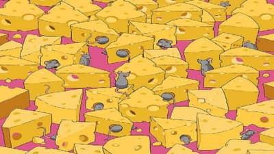 खरं तर या चित्रात चीज आणि उंदीर दिसत आहेत. तिथे पडलेल्या पिवळ्या रंगाच्या वस्तूभोवती उंदीर घिरट्या घालत असतात.