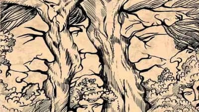 चित्रात दोन झाडं सरळ उभी आहेत, ज्यांच्या फांद्या बाहेर आहेत आणि काही पानंही आहेत, असं चित्रात दिसतं. त्याचबरोबर झाडांखाली काही अतिशय दाट झुडपे आहेत.