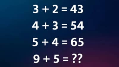खरंतर तुम्हाला या प्रश्नात विचारण्यात आले आहे की, जर 3+2 ची बेरीज 43 असेल, 4+3 ची बेरीज 54 असेल आणि 5+4 ची बेरीज 65 असेल तर 9+5 ची बेरीज काय असेल? आता जर तुम्हाला हा प्रश्न दिसायला अगदी सोपा वाटत असेल तरी तसे नाही, तो अवघड आहे. ज्यांनी हा प्रश्न हलकेपणाने घेतला त्यांनाही तो सोडवताना घाम फुटला आणि असे असूनही अनेकांना तो सोडवता आला नाही. जर आपण हा प्रश्न सोडवू शकत नसाल तर घाबरू नका, आम्ही खाली या प्रश्नाचे उत्तर दिले आहे. तुम्ही ते पाहू शकता.