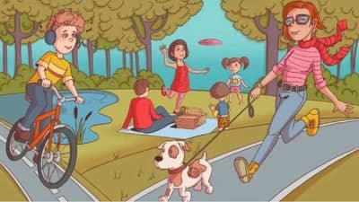 या फोटोत काही मुले खेळत आहेत आणि एक मुलगी कुत्र्याला घेऊन जात आहे. त्याचवेळी समोरून एक मुलगी सायकल घेऊन येत आहे. या प्रश्नाचं उत्तर तुम्हाला दहा सेकंदात शोधायचं आहे आणि हेच खरं आव्हान आहे.