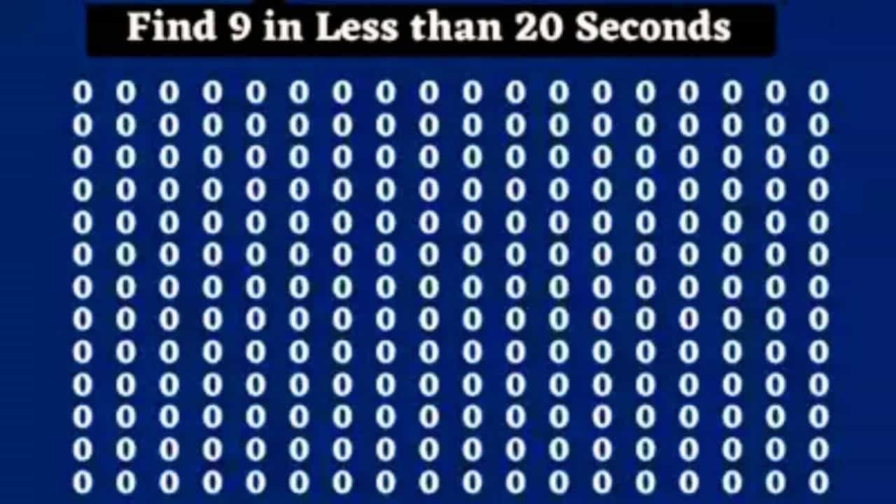 या चित्रात 20 सेकंदात तुम्हाला 9 हा अंक शोधून दाखवायचा आहे. हे चित्र बघा, कोडे सोडवायचे म्हणजे ते लवकरात लवकर सोडवता यायला हवे. या कोड्यात काय शोधायचं आहे हे लक्षात आलंय का? यात तुम्हाला 9 हा अंक शोधायचा आहे. आम्ही सांगतो याचं उत्तर कसं शोधतात. यात तुम्हाला सगळे शून्यच दिसतील. आता एक एक ओळ व्यवस्थित बघा. वरून-खाली, डावीकडून उजवीकडे बघत जा. तुम्हाला 9 हा अंक शोधायचा आहे हे डोक्यात ठेवा. अंक दिसला?