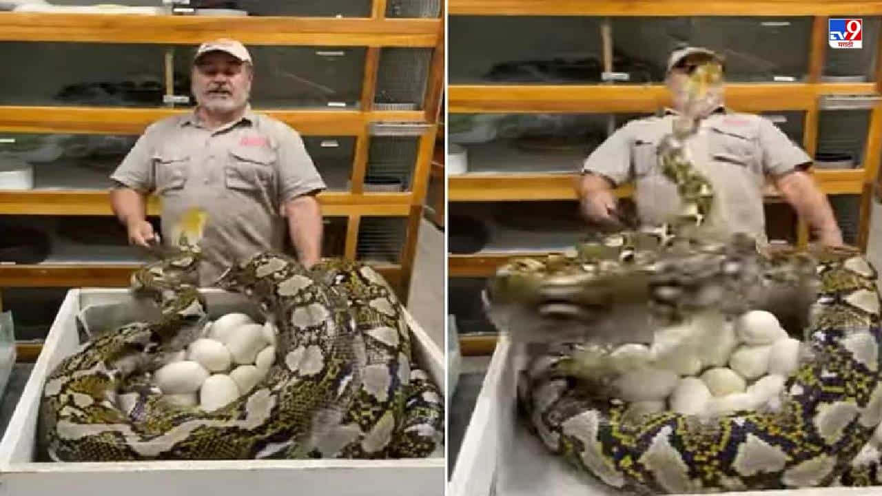व्हिडिओमध्ये तुम्ही पाहू शकता की, मादी अजगर एका छोट्या बॉक्समध्ये भरपूर अंडी घालून बसलेली आहे. ही अंडी त्याच अजगराची आहेत, ज्यामध्ये त्याची पिल्ले वाढत आहेत. आता तुम्हाला हे माहित असेलच की, काही सापांच्या प्रजाती सोडल्या तर बहुतेक साप थेट पिल्लं जन्माला घालत नाहीत, आधी अंडी घालतात, जी काही दिवसांनी उबवतात आणि त्यातून पिल्लं बाहेर येतात. त्यामुळे ही मादी अजगर आपल्या पिल्लांचे म्हणजेच अंड्यांचे रक्षण करत आहे.