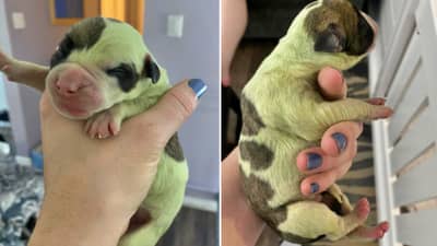 Rare green furred puppy : सोशल मीडियावर आपण व्हिडिओ, फोटो पाहत असतो. विशेषत: जे व्हायरल होतात, ते कुठेतरी लोकांना आवडलेले असतात, त्यामुळे वेगाने शेअर केले जातात. आता एक आगळाच फोटो सोशल मीडियावर व्हायरल झालाय. हा फोटो आहे एका कुत्र्याचा.. तुम्ही म्हणाल, सोशल मीडियावर (Social media) तर कुत्र्याशी (Dogs) संबंधित हजारो फोटो आणि व्हिडिओ (Videos) नेहमीच अपलोड होतात, त्यात वेगळं ते काय? मात्र आता जो फोटो व्हायरल झालाय, तो खूप वेगळा आहे. अत्यंत दुर्मीळ घटनेत एका कुत्र्याने हिरव्या पिल्लाला जन्म दिला आहे. तेव्हापासून हा फोटो सोशल मीडियावर व्हायरल होत आहेत. मात्र, या हिरव्या रंगाच्या पिल्लाचा जन्म होताच त्याचे मालक घाबरले. या पिल्लाची आई फ्रेया बुलडॉग प्रजातीची आहे.