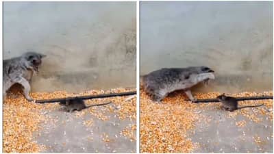 या व्हिडीओमध्ये तुम्ही पाहू शकता की एक काळ्या रंगांचा छोटा उंदीर मक्काच्या दाण्याजवळ बसलेला आहे. याचदरम्यान एक मांजर देखील तिथे येते. ही मांजर या उंदारावर हल्ला करते. मात्र हा उंदीर मोठ्या हुशिराने मांजराचा हल्ला परतून लावतो. शेवटी मांजर थकते. उंदीर तिथेच बसला आहे. मांजर पुन्हा एकदा उंदरावर हल्ला करते. मात्र पुन्हा उंदीर मांजराचा हल्ला परतून लावतो, शेवटी मांजर कंटाळून तिथून निघून जाते. हा व्हिडीओ सध्या सोशल मीडियावर प्रचंड व्हायरल होत असून, नेटकरी या मांजराचे कौतुक करत आहेत.