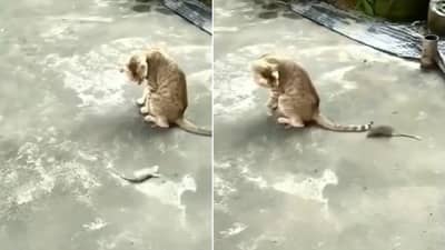 व्हायरल होत असलेल्या या व्हिडिओमध्ये तुम्ही बघू शकता की मांजर बसली आहे आणि उंदीर तिच्यासमोर आडवे होत तिच्याभोवती फेऱ्या मारायला लागतो. असे करत असताना तो मांजराच्या शेपटीपर्यंत पोहोचतो, त्यानंतर मांजर तिथून उठते आणि उंदराला मारण्याचा प्रयत्न करते. पण तिला ते शक्य होत नाही.