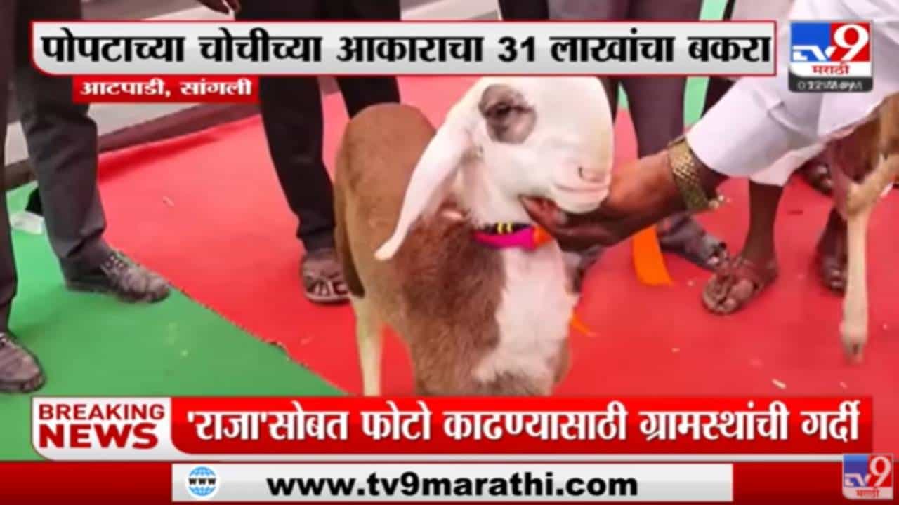 सांगली : बकऱ्याची लाखाच्या घरातल्या किमती आपल्यासाठी नवीन नाहीत. त्यांची लाखात लागलेली बोली आपण पाहिली आहे. पण सध्या सोशल मीडियावर सांगलीच्या राजाची (Raja Bakara-Sangli) चर्चा आहे ती त्याच्या किमतीसोबतच त्याच्या तोंडाच्या आकारामुळे. कारण या राजाच्या तोंडाचा आकार हा पोपटाच्या चोचीसारखा आहे. त्यामुळे हा बकरा चांगलाच चर्चेत आला आहे. त्याची किंमत आहे 31 लाख रूपये… या राजाचा मंत्री एकनाथ शिंदे यांच्या हस्ते सत्कारही करण्यात आला आहे. याची सध्या सोशल मीडियावर जोरदार चर्चा (Viral Video) आहे.