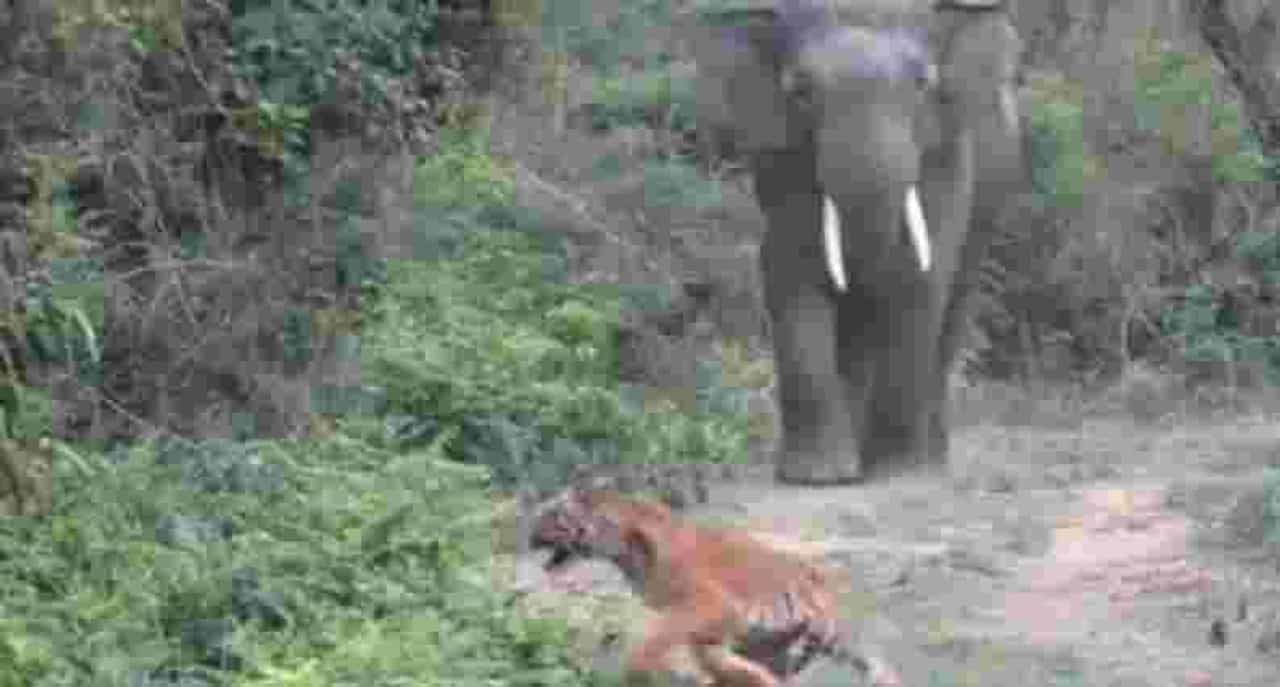 सोशल मीडियावर व्हायरल होत असलेला व्हिडिओ पाहून तुम्हालाही हत्तीचा दरारा काय असतो, याची कल्पना येऊ शकते. (Seeing the elephant, the tiger ran away; People said, I don't know who is the king of the forest)