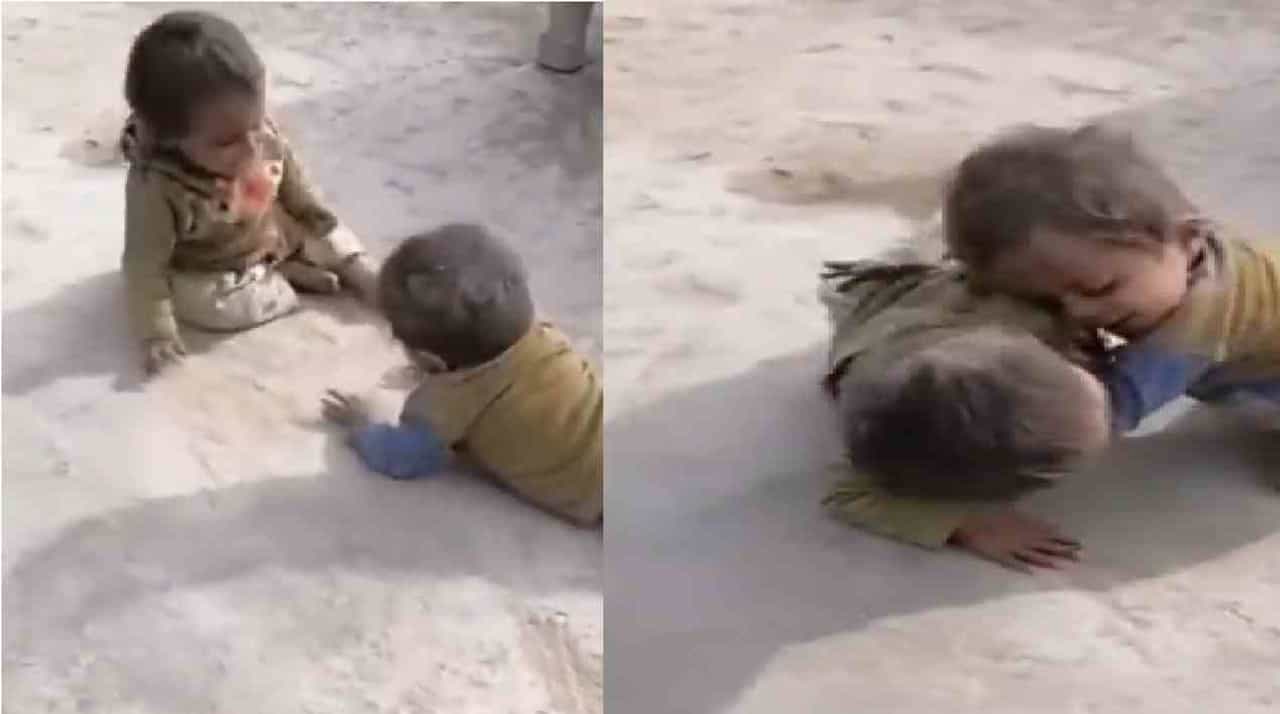 (small children playing wrestling on road funny video went viral on social media)