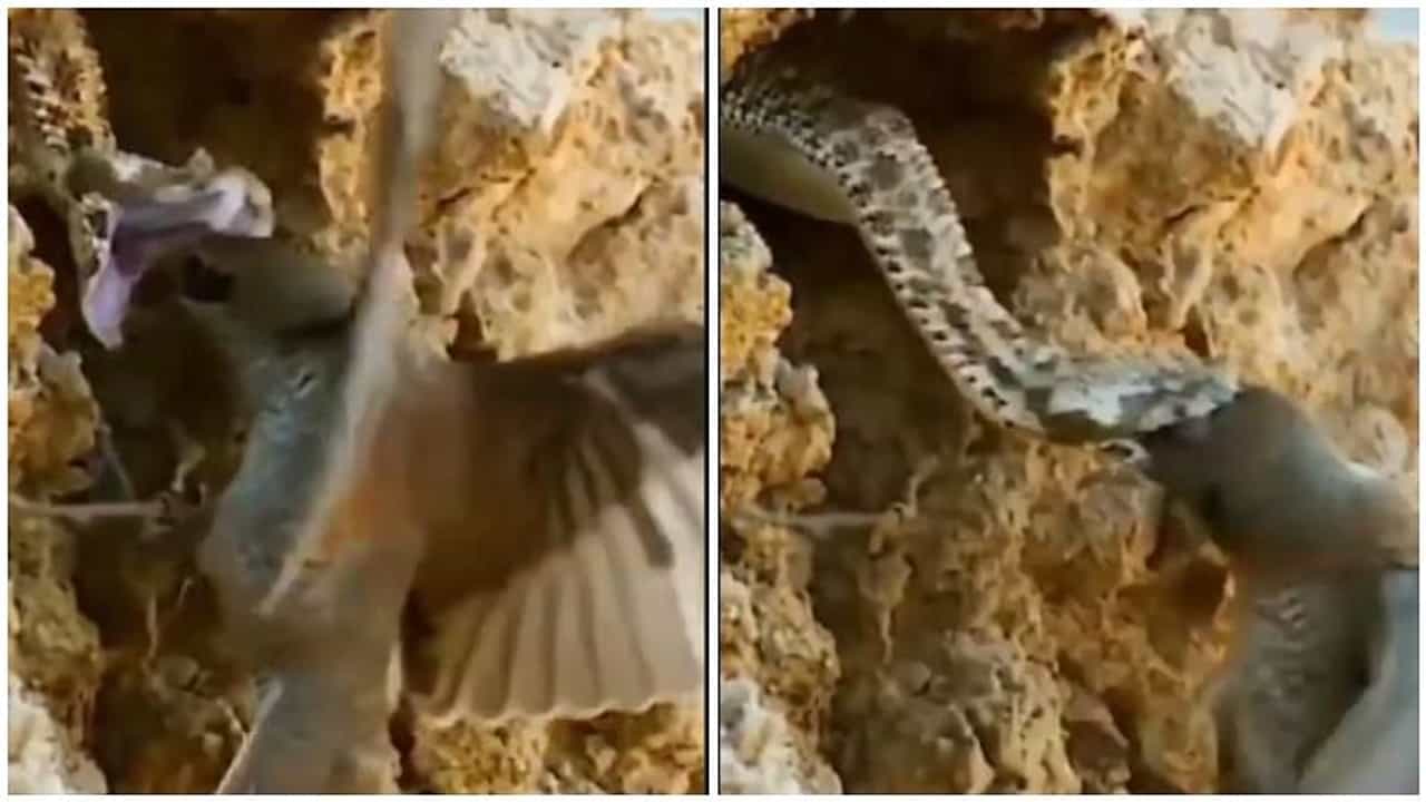 सापापासून सुटका होताच पक्ष्याने पळ काढला