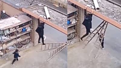 व्हायरल व्हिडीओमध्ये एक सीसीटीव्ही व्हिडिओ व्हायरल झाल्याचं पाहायला मिळत आहे. यामध्ये एक महिला दरवाजाजवळ शिडी लावून काहीतरी करत होती. या दरम्यान शिडी खाली पडली, जेव्हा शिडी खाली पडली तेव्हा ती वरच्या बारला लटकली. तिने त्याला पकडून ठेवले शिडी पडताच तिथे उभा असलेला तिचा लहान मुलगा लगेच पटकन शिडीजवळ गेला आणि त्याने आईची मदत केली.