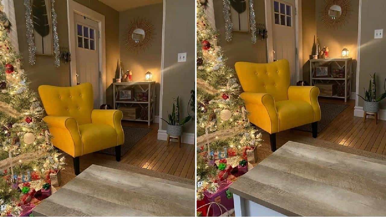 आपण पाहू शकता की हा एका हॉलचा देखावा आहे ज्यामध्ये ख्रिसमस ट्री सुंदरपणे सजवलेले आहे. खूप छान सजावट आहे. सौंदर्यात भर पडावी म्हणून भेटवस्तू ठेवलेल्या आहेत. खोली अधिक सुंदर व्हावी यासाठी भिंतीवर तसेच खुर्ची आणि सेंटर टेबलवर पेंटिंग्ज लावलेले आहेत.