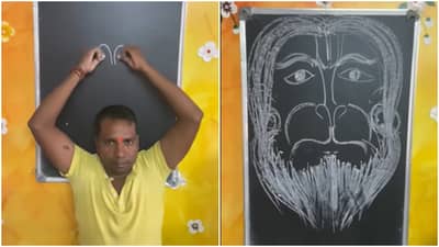 व्हिडिओमध्ये तुम्ही पाहू शकता, की एक चित्रकार दिसत आहे. हा चित्रकार आपल्याकडे तोंड करून उभा आहे. म्हणजेच कॅमेऱ्याच्या समोर आहे. तर त्याच्या पाठीमागे एक फलक दिसत आहे. हातात खडू आहे. मग एक संपूर्ण खडू दोन हातांनी पकडून त्याला बरोब्बर मध्यभागी धरून त्याचे तुकडे करतो. त्यानंतर दोन्ही हात वर करून आणि समोर पाहून तो आपल्या पाठीमागे असलेल्या फलकावर हनुमानाचे चित्र काढतो.