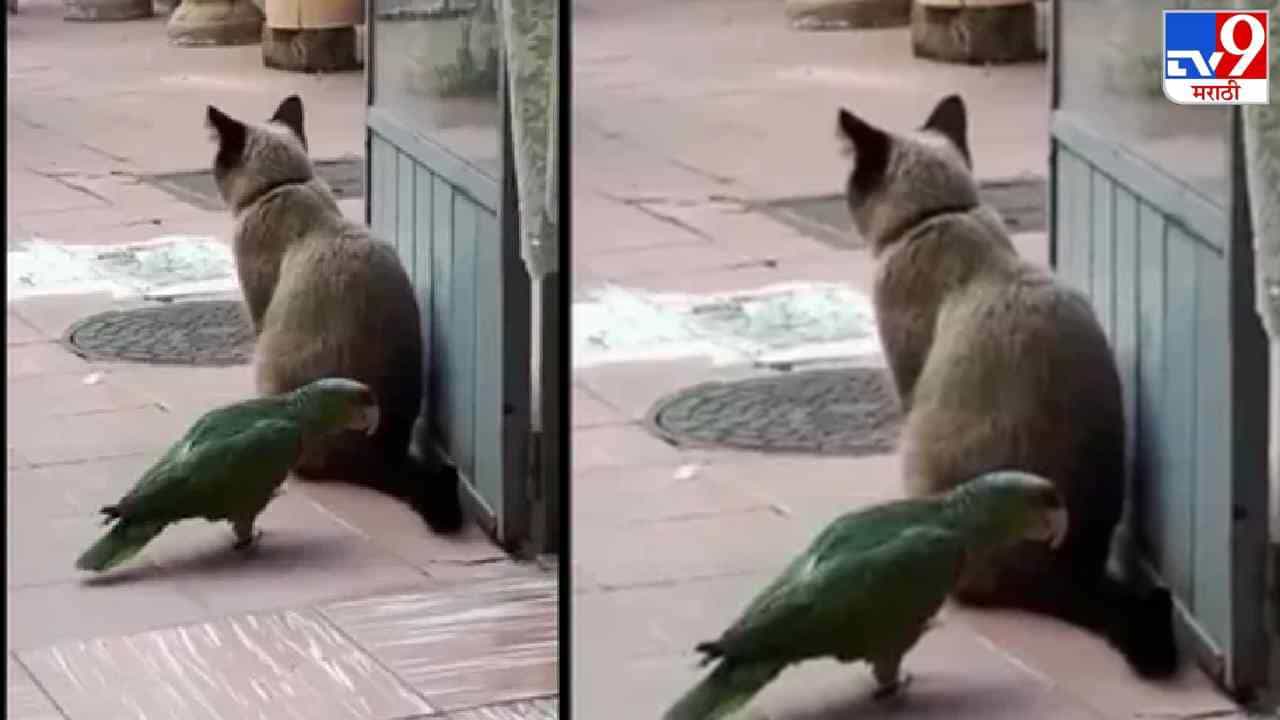 Video: मांजरीच्या शेपटीला पकडण्याचा प्रयत्न करणारा पोपट, सोशल मीडियावर व्हिडीओ व्हायरल