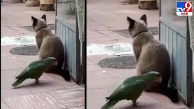 व्हिडिओमध्ये पाहु जाऊ शकता की, या व्हिडिओची सुरुवातीला मांजर शेपटी हलवत आहे. आणि सोबत बसलेला पोपट तोंड उघडतो आणि पायांच्या मदतीने शेपटी पकडण्याचा प्रयत्न करतो. पक्ष्याच्या हालचाली पाहून, मांजर घाबरते आणि दुसऱ्या बाजूला उडी मारते.