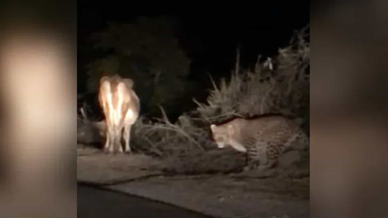 गाडीच्या लाईटमुळे बिबट्या एकसारखा उभा आहे. काहीवेळाने गाईच्या मागच्या बाजूने बिबट्या पुढच्या बाजूला निघतो. गाईच्या पुढच्याबाजून रस्त्याने पुढे निघतो. त्यावेळी गाडी सुद्धा बिबट्याच्या मागून जात आहे.
