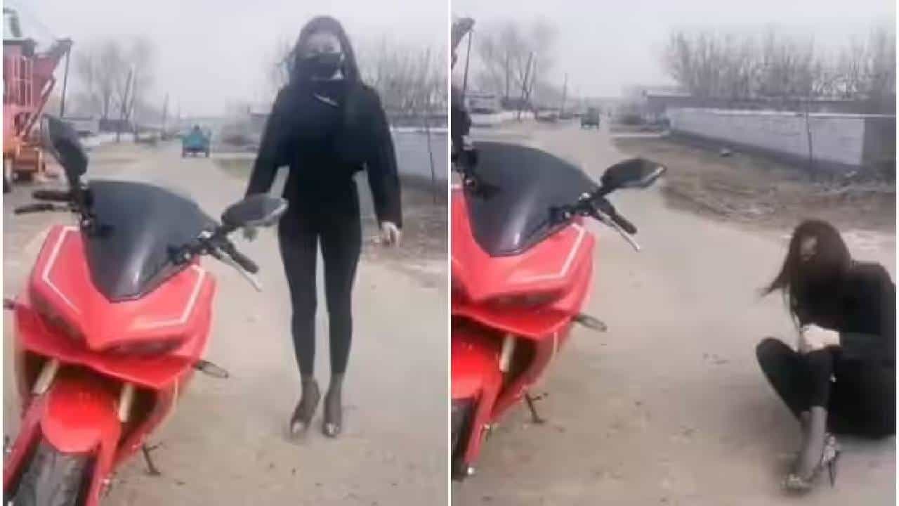 हा व्हिडीओ ट्विटरवरती @TheBest_Viral नावाच्या अकाऊंटवरुन शेअर करण्यात आला आहे. एक तरुणी उंच टाचेचं चप्पल घालून स्पोर्टस बाईकवरती स्टाईल मारुन बसण्याचा प्रयत्न करीत आहे. त्यावेळी तिच्याकडून एक छोटीसी चुकी होते आणि तिचा बॅलेन्स बिघडून जातो. त्यामुळे ती अचानक जमीनीवर पडते. हा व्हिडीओ पाहिल्यानंतर लोकं तिला खळखळून हसतात.