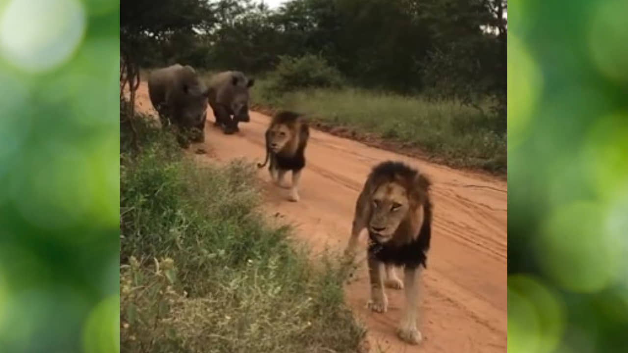 जर तुम्ही वन्यप्रेमी आहात, तर हा व्हिडीओ तुमच्यासाठीच आहे. सोशल मिडीयावर नेहमीच मजेशीर व्हिडीओ व्हायरल करणाऱ्या The Figen नावाच्या युजरने हा व्हिडीओ व्हायरल केला आहे. ट्वीटरवर हा व्हिडीओ शेअर झाला असून ३० सेंकदाच्या या व्हिडीओ क्लीपमध्ये मजेशीर दृश्य आहे. या व्हिडीओमध्ये जंगलाचा राजा मानला जाणाऱ्या सिंहाची जोडी आराम करताना दिसत आहे. मातीच्या ओबडधोबड जंगलातील रस्त्यावर ही राजाची जोडी आराम करीत असताना तेवढ्यातच तेथे गेंड्यांची एक जोडी भटकत भटकत येते. या गेंड्यांना पाहून राजा असलेला सिंह चक्क उभा राहतो आणि आपली गेंड्यांना आपली वाट मोकळी करून देताना दिसत आहे. हे सिंह या गेंड्यांपासून शक्य तेवढे दूरवर जाताना दिसत आहेत.